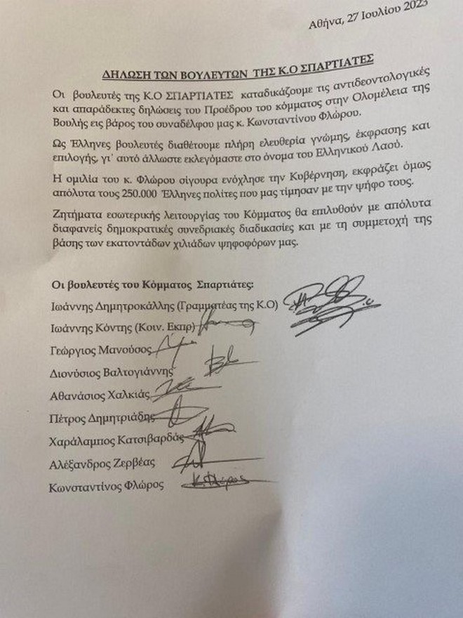 Μετά από αυτά εκδηλώθηκε πρωτοβουλία στήριξης του Κ.Φλώρου την οποία συνυπογράφουν 8 από τους 12 βουλευτές των Σπαρτιατών: Οι Ι.Δημητροκάλης, Ι.Κοντης, Γ.Μανούσος, Δ.Βαλτογιάννης, Αθ.Χαλκιάς, Π.Δημητριαδης, Χ.Κατσιβαρδάς και Α.Ζερβέας. Στην επιστολή υποστηρίζεται ότι «καταδικάζουμε τις απαράδεκτες δηλώσεις του προέδρου του κόμματος» παραπέμποντας μάλιστα σε εσωκομματικές διαδικασίες.