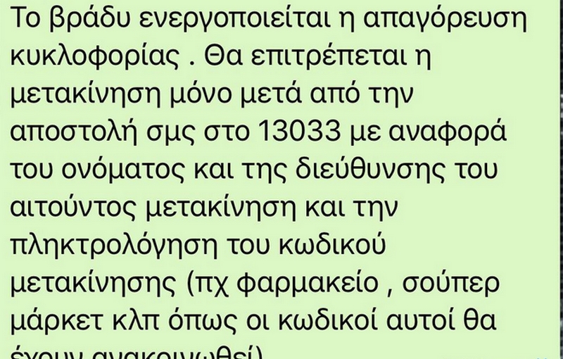 Οι πολίτες θα στελνουν σε ειδικό πενταψήφιο αριθμό και θα ενημερώνουν για το το πού πρόκειται να πάνε, ενώ με βάση τις πρώτες πληροφορίες ο αριθμός θα είναι το 13033.