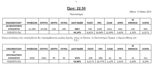 Παρά το σκηνικό βίας των κουκουλοφόρων στις διάφορες Σχολές και την τρομοκρατία που προσπάθησαν να επιβάλουν, με τις πλάτες της Κυβέρνησης, η συμμετοχή άγγιξε τις 100.000 και η ΔΑΠ ΝΔΦΚ ανέβασε τη δύναμή της και στα Πανεπιστήμια και στα ΤΕΙ.