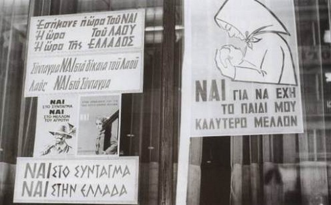 1968: Η χούντα των συνταγματαρχών διενεργεί δημοψήφισμα στις 29 Σεπτεμβρίου για σχέδιο συντάγματος που είχε εκπονήσει η ίδια. Στο δημοψήφισμα – παρωδία το “ναι” αποσπά ποσοστό 92,21% και το “όχι” το 7,79%. Στη διαδικασία δεν είχαν δικαίωμα συμμετοχής οι πολιτικοί κρατούμενοι που είχαν συλληφθεί ή εκτοπιστεί μετά το πραξικόπημα της 21ης Απριλίου του 1967.