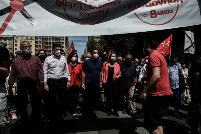 Ο Αλέξης Τσίπρας με την Μαριλίζα Ξενογιαννακοπούλου στην απεργιακή συγκέντρωση της 6ης Μάη Eurokinissi