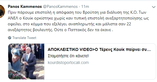 Αναλυτικά γράφει (η ορθογραφία δική του): “Πριν πάρουμε επιστολή η απόφαση του Βρούτση για διάλυση της Κ.Ο. Των ΑΝΕΛ ο Κουίκ ορκίστηκε χωρίς καν τυπική επιστολή ανεξαρτητοποίησης ως οφείλει, στο κόμμα που εξελέγει, αναπληρωτής και μάλιστα σαν 22 ανεξάρτητος βουλευτής. Ούτε ο Παττακός δεν τα έκανε”.