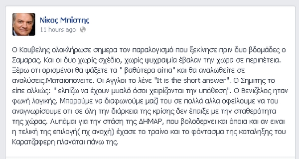 “Ο Κουβέλης ολοκλήρωσε σήμερα τον παραλογισμό που ξεκίνησε πριν δυο βδομάδες ο Σαμαράς. Και οι δυο χωρίς σχέδιο, χωρίς ψυχραιμία έβαλαν την χωρά σε περιπέτεια. Ξέρω ότι ορισμένοι θα ψάξετε τα ” βαθύτερα αίτια” και θα αναλωθείτε σε αναλύσεις. Ματαιοπονείτε. Οι Άγγλοι το λένε “It is the short answer”. Ο Σημίτης το είπε αλλιώς: