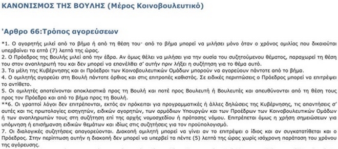 Όπως φαίνεται, το άρθρο 66 της βουλής δεν επιτρέπει την επιστροφή στο προεδρείου της προέδρου, εφόσον έχει αγορεύσει από το βήμα της. Αυτό επεσήμανε και ο κύριος Σαμαράς που της ανέφερε: “Ανεβήκατε πάνω την ώρα που μιλούσα για θεσμική παρωδία. Θα έπρεπε να γνωρίζετε αν και νέα συνάδελφος, είστε ΠτΒ. Θα πρέπει να γνωρίζετε ότι απαγορεύεται η ΠτΒ να παραβιάζει τον κανονισμό του σώματος”.