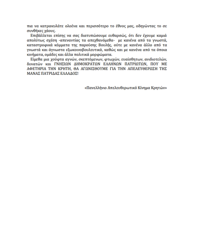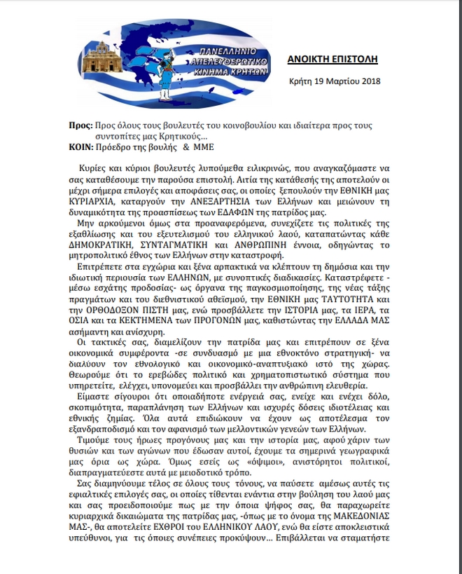 Ο βουλευτής του Ποταμιού αποκάλυψε ότι απειλητική επιστολή στους βουλευτές έστειλε και το Απελευθερωτικό Κίνημα Κρητών μετά τις Παμμακεδονικές οργανώσεις. «Αν δεν ήταν επικίνδυνο, θα ήταν γελοίο» σχολίασε