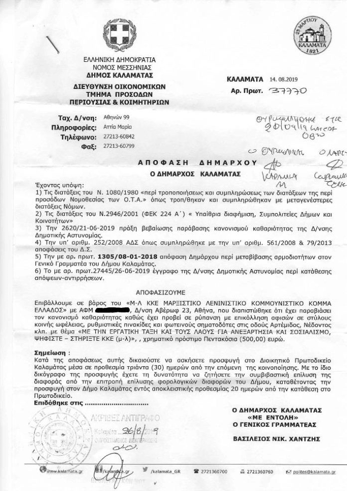 Με απόφαση τού Δημάρχου Καλαμάτας, επιβάλλεται στο Μ-Λ ΚΚΕ, πρόστιμο 500€, σύμφωνα με τις διατάξεις …5 νόμων. Οι διατάξεις αφορούν την αφισοκόλληση και εφαρμόζονται για την προεκλογική περίοδο του Ιούνη του 2019, στην Καλαμάτα. Η απόφαση κοινοποιήθηκε τρεις μήνες μετά τις εκλογές. Με αυτήν και παρόμοιες αποφάσεις, επιχειρείται η φίμωση των απόψεων των κομμάτων της πραγματικής αριστεράς.