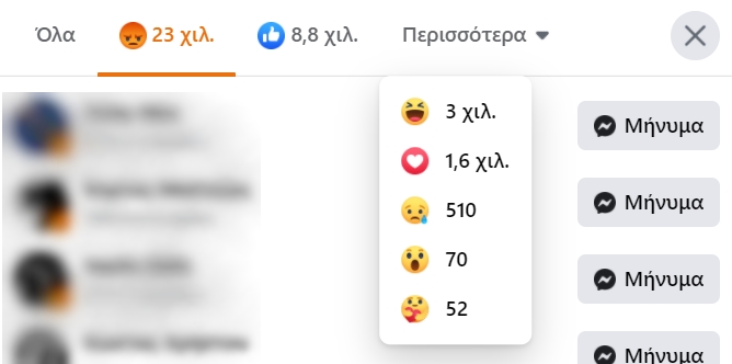 Η αποδοκιμασία του κοινού στο ανισοβαρές διάγγελμα καταγράφεται όχι μόνο από τα σχόλια καθεαυτά, τα οποία λίγο πολύ τα περιμέναμε, αλλά από τα “reactions” κάτω από το επίμαχο βίντεο με τις δηλώσεις του πρωθυπουργού προς τον ελληνικό λαό. Πάνω από 23 χιλιάδες ήταν οι αρνητικές αντιδράσεις εκδήλωσης “θυμού”, με τις θετικές αντιδράσεις να μη φτάνουν ούτε τις 2 χιλιάδες.