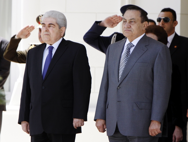 Ο Αιγύπτιος Πρόεδρος Χόσνι Μουμπάρακ με τον Δημήτρη Χριστόφια χαιρετούν την τιμητική φρουρά στο Προεδρικό Μέγαρο στο Κάιρο της Αιγύπτου στις 7 Απριλίου 2009.