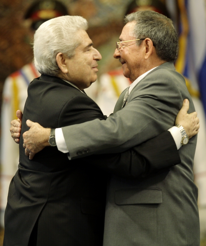 Ο Πρόεδρος της Κούβας, Ραούλ Κάστρο, καλωσορίζει τον Πρόεδρο της Κυπριακής Δημοκρατίας Δημήτρη Χριστόφια μετά την παραλαβή του μετάλλου Χοσέ Μάρτι στο ανάκτορο της Επανάστασης στην Αβάνα στις 28 Σεπτεμβρίου 2009. Ο Χριστόφιας βρίσκεται στην Κούβα για διήμερη επίσκεψη.