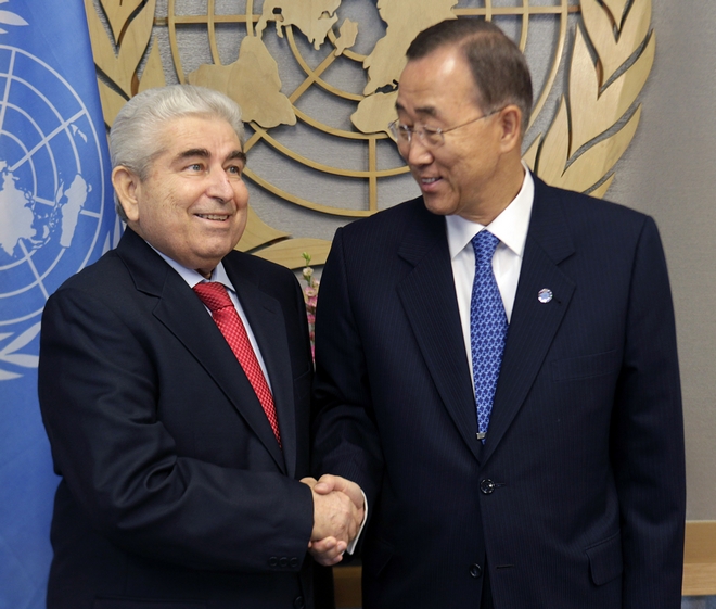 Ο Δημήτρης Χριστόφιας κάνει χειραψία με τον Γενικό Γραμματέα των Ηνωμένων Εθνών Μπαν Κι-μουν κατά τη 66η σύνοδο της Γενικής Συνέλευσης στα κεντρικά γραφεία των Ηνωμένων Εθνών στις 19 Σεπτεμβρίου 2011.
