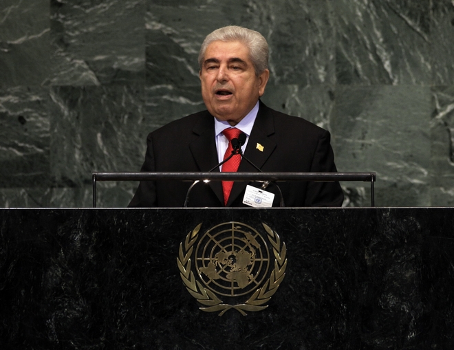 Ο Δημήτρης Χριστόφιας μιλά κατά τη διάρκεια της Γενικής Συνέλευσης των Ηνωμένων Εθνών στην έδρα του Ηνωμένου Βασιλείου στις 24 Σεπτεμβρίου 2012.