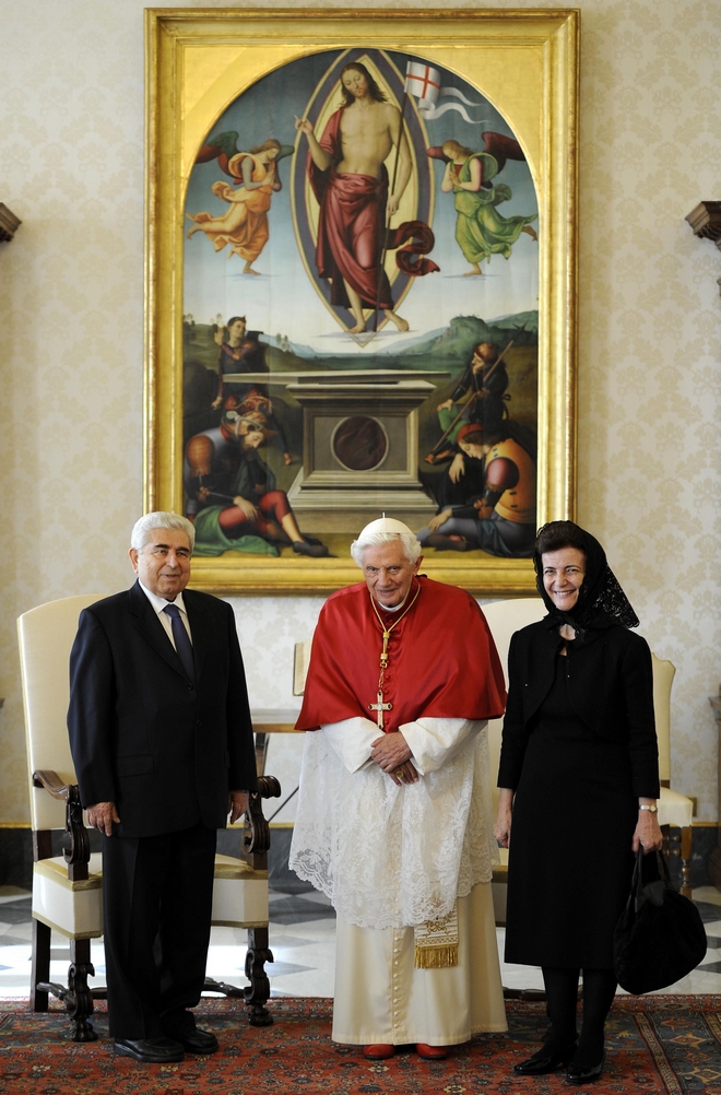 Ο Πάπας Βενέδικτος XVI και ο Δημήτρης Χριστόφιας, μαζί με τη σύζυγό του Έλση Χριστόφια, σε συνάντηση ιδιωτικού ακροατηρίου” στη βιβλιοθήκη του Πάπα στο Βατικανό στις 25 Οκτωβρίου 2012.