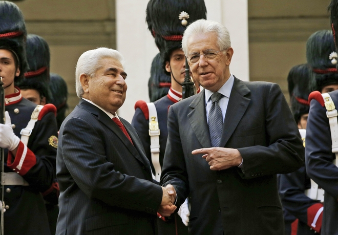 Ο Δημήτρης Χριστόφιας κάνει χειραψία με τον Ιταλό πρωθυπουργό, Μάριο Μόντι, πριν από τις συνομιλίες στη Ρώμη στις 17 Οκτωβρίου 2012.