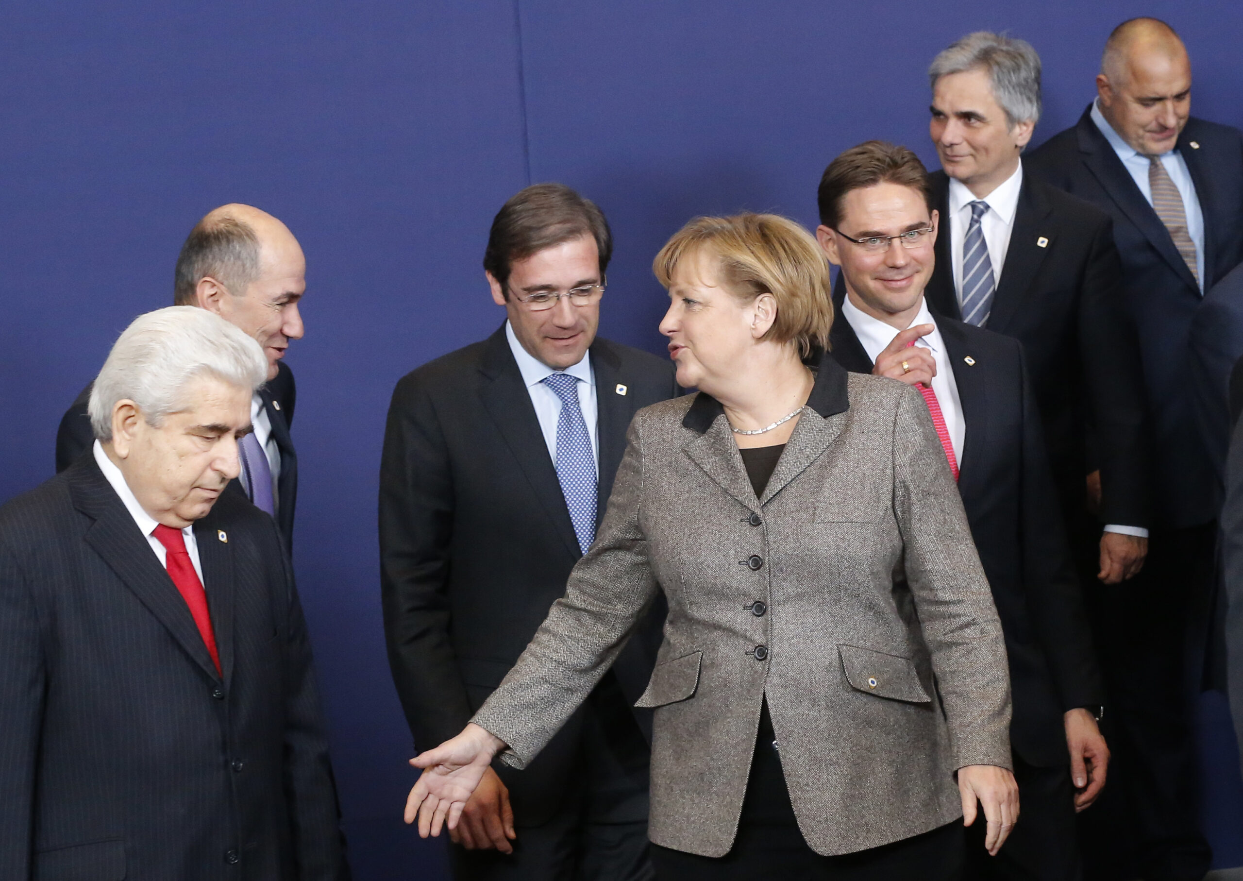 Η Γερμανίδα καγκελάριος, Άνγκελα Μέρκελ, ο Δημήτρης Χριστόφιας, ο πρωθυπουργός της Σλοβενίας, Janez Jansa, ο πρωθυπουργός της Πορτογαλίας, Πέδρο Πάσο Κοελό, ο πρωθυπουργός της Φινλανδίας, Τζάρκι Τπατάνι Καταίνεν, ο Αυστριακός καγκελάριος, Βέρνερ Φάιμαν, και ο πρωθυπουργός της Βουλγαρίας, Μπόικο Μπορίσοφ, σε μια ομαδική φωτογραφία στη Σύνοδο κορυφής της ΕΕ στις Βρυξέλλες στις 13 Δεκεμβρίου 2012. Η Ευρωπαϊκή Ένωση πραγματοποίησε την Πέμπτη ένα σημαντικό βήμα προς μία από τις σημαντικότερες μεταβιβάσεις οικονομικής εξουσίας από τις εθνικές πρωτεύουσες όταν τα κράτη μέλη της συμφώνησαν να δημιουργήσουν μια ενιαία εποπτεία για τις τράπεζές τους.