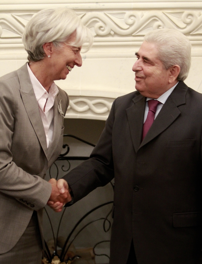 Η Διευθύνουσα Σύμβουλος του Διεθνούς Νομισματικού Ταμείου (ΔΝΤ) Κριστίν Λαγκάρντ στον χαιρετισμό της με τον Πρόεδρο της Κυπριακής Δημοκρατίας Δημήτρη Χριστόφια στο Προεδρικό Μέγαρο στην πρωτεύουσα της Κύπρου, στις 13 Σεπτεμβρίου 2012. Η Λαγκάρντ βρίσκεται στην Κύπρο για άτυπο ευρωπαϊκό οικονομικό και χρηματοπιστωτικό συμβούλιο.