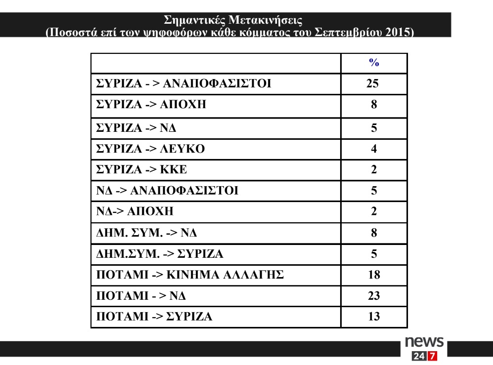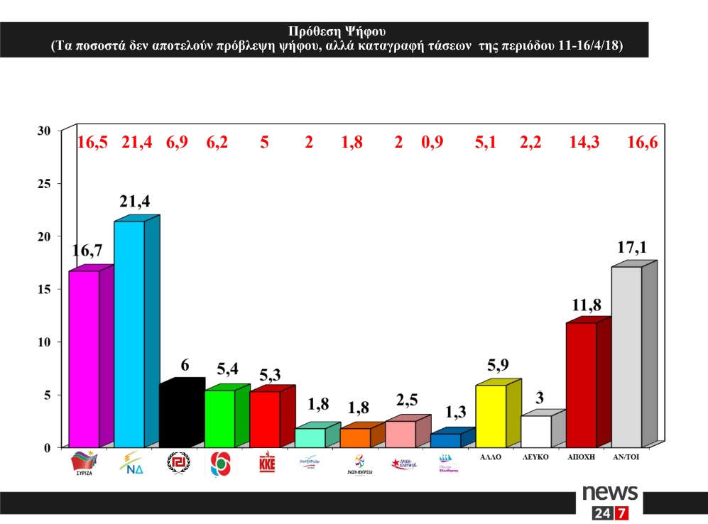 Σύμφωνα με τα αποτελέσματα της έρευνας, η ΝΔ συγκεντρώνει στην πρόθεση ψήφου ποσοστό 21,4% – ακριβώς το ίδιο ποσοστό που εμφανιζόταν και στην προηγούμενη αντίστοιχη μέτρηση της ίδιας εταιρίας – ενώ το ποσοστό του ΣΥΡΙΖΑ αυξάνεται κατά 0,2% και φθάνει στο 16,7% του δείγματος.