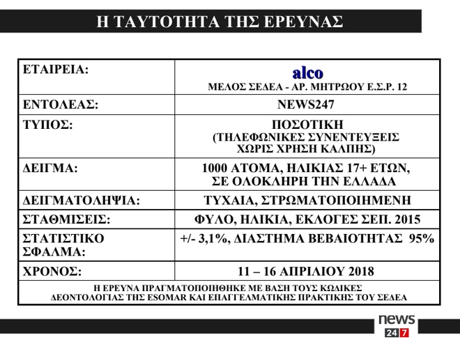 Ελαφρώς μειωμένη ψαλίδα στην πρόθεση ψήφου ανάμεσα στη Νέα Δημοκρατία και στον ΣΥΡΙΖΑ, καταγράφεται στη δημοσκόπηση της Alco για το Νews 24/7 που διενεργήθηκε το χρονικό διάστημα 11-16 Απριλίου, με τη διαφορά να περιορίζεται στις 4,7 μονάδες έναντι 4,9 τον Φεβρουάριο του 2018, στην αντίστοιχη μέτρηση της ίδιας εταιρείας.