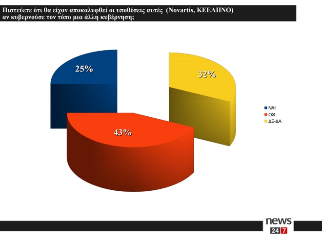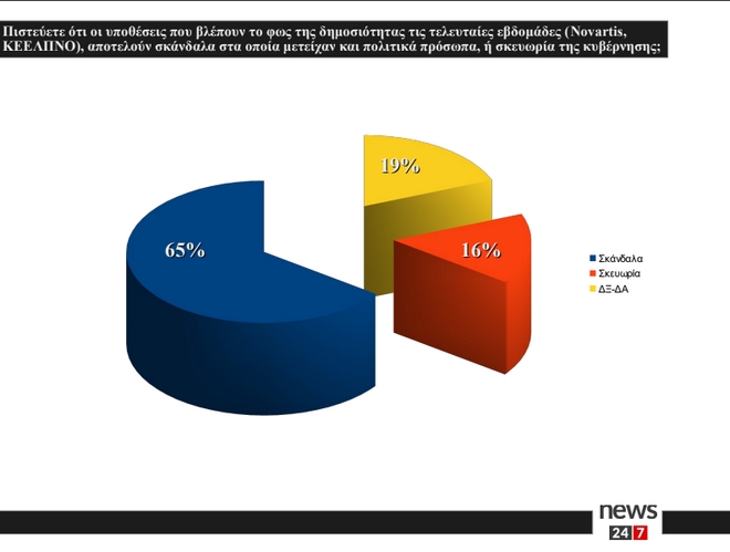 Οι δύο στους τρεις ερωτηθέντες (ποσοστό 65%) θεωρούν ότι υποθέσεις που συζητήθηκαν τον τελευταίο καιρό (Novartis, ΚΕΕΛΠΝΟ) συνιστούν σκάνδαλα, στα οποία υπάρχει εμπλοκή και πολιτικών προσώπων.