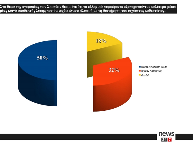 Στα σημαντικά συμπεράσματα που προκύπτουν με βάση τα αποτελέσματα της δημοσκόπησης, καταγράφεται η διαμόρφωση “ρεαλιστικής” αντίληψης σε σχέση με το θέμα της πρώην Γιουγκοσλαβικής Δημοκρατίας της Μακεδονίας, καθώς οι ερωτηθέντες στην πλειοψηφία τους (ποσοστό 50%) θεωρούν ότι τα ελληνικά συμφέροντα υπηρετούνται από μία κοινά αποδεκτή λύση και όχι από το ισχύον καθεστώς (32%).
