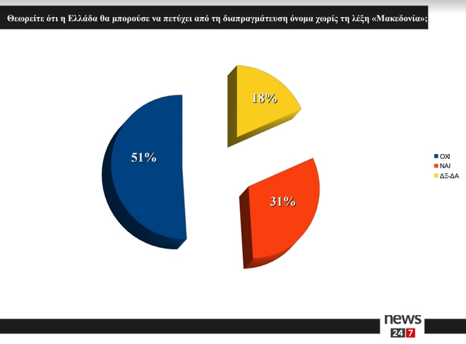 Παράλληλα, ένας στους δύο περίπου (ποσοστό 51%) εκτιμά ότι η διαπραγμάτευση δεν μπορεί να οδηγήσει σε όνομα του γειτονικού κράτους χωρίς τη λέξη «Μακεδονία».