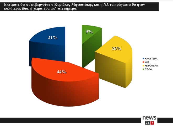 Στη δημοσκόπηση της Alco αποτυπώνεται ακόμη η αντίληψη (σε ποσοστό 44%) ότι μία κυβέρνηση της Νέας Δημοκρατίας θα απέδιδε σε γενικές γραμμές τα ίδια αποτελέσματα με τη σημερινή.
