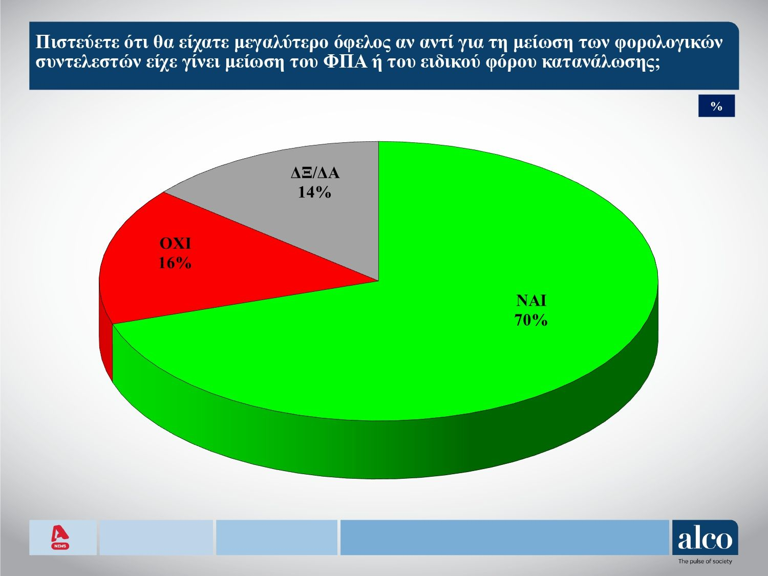 Όταν οι ερωτηθέντες κλήθηκαν να συγκρίνουν την επίδραση μιας πιθανής μείωσης ΦΠΑ με τη μείωση των φορολογικών συντελεστών, το 70% προτίμησε τη μείωση ΦΠΑ ως πιο ωφέλιμη για τα νοικοκυριά.