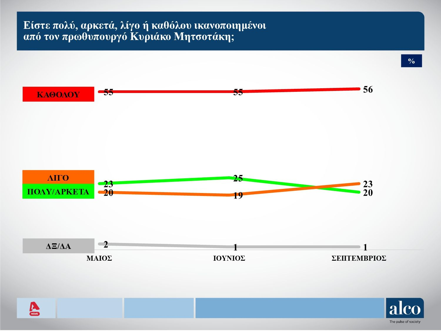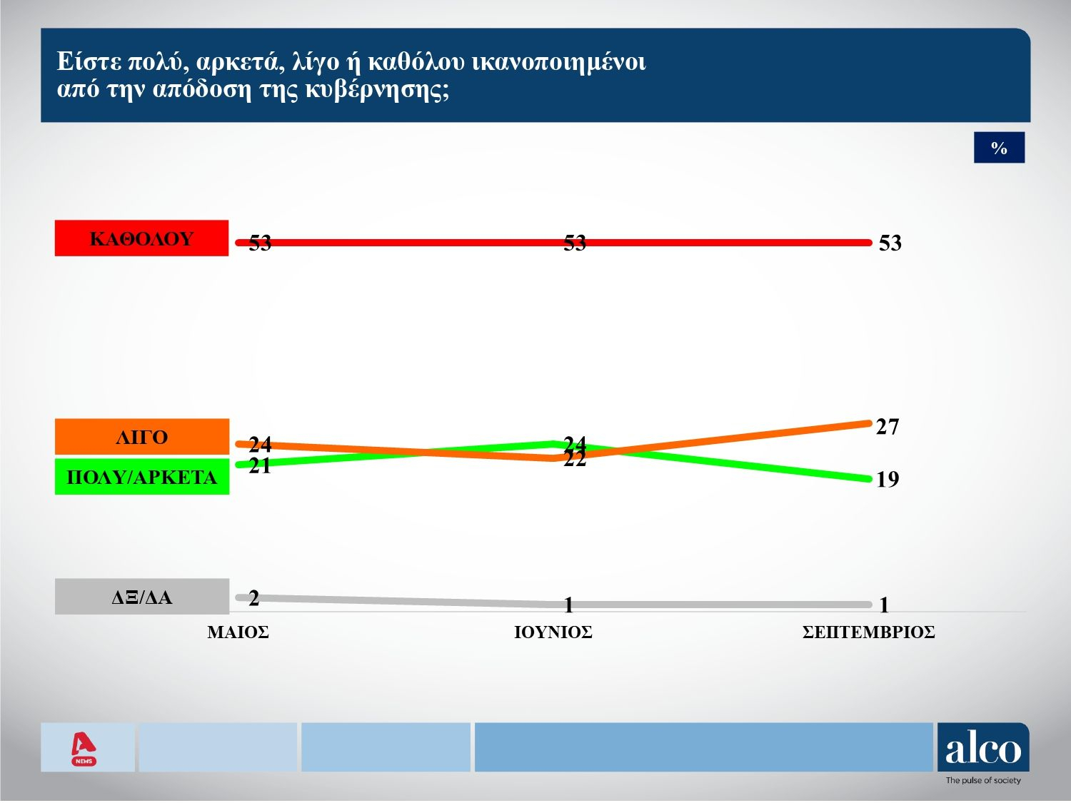 Σε ερώτηση για το κατά πόσο εκφράζουν ικανοποίηση από την απόδοση της κυβέρνησης το 53% απάντησε “καθόλου”, ενώ στην ίδια ερώτηση για τον πρωθυπουργό Κυριάκο Μητσοτάκη, το 56% δήλωσε καθόλου ικανοποιημένο.