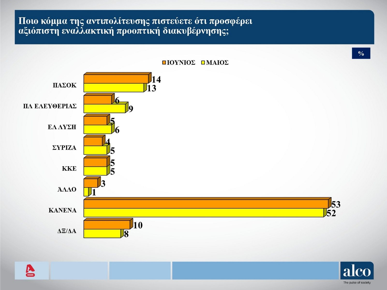 Σταθερά κανένα κόμμα δεν αποτελεί καλή εναλλακτική διακυβέρνηση για τον ψηφοφόρο από τα κόμματα της αντιπολίτευσης με το σαρωτικό 53%.