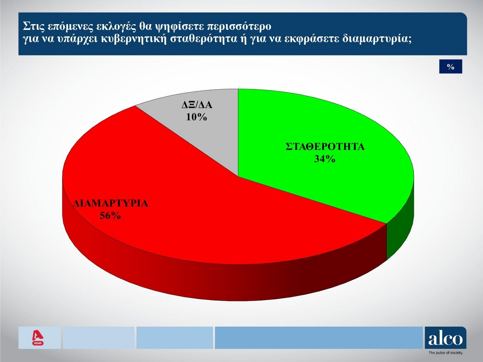 Σημειώνεται, επίσης, ότι σε υψηλά επίπεδα είναι η ψήφος διαμαρτυρίας με 56%, ενώ το 34% δηλώνει ότι θα επιλέξει κόμμα στις επόμενες εκλογές με γνώμονα τη σταθερότητα.
