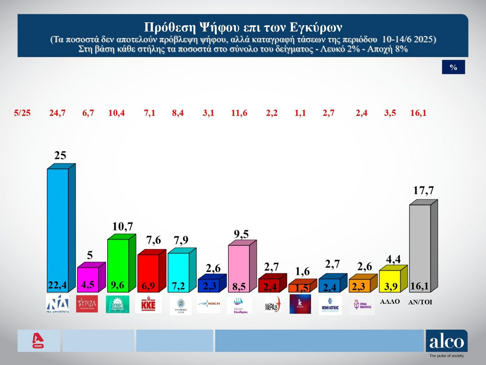 Δημοσκόπηση ALCO: Στο 25% η ΝΔ – Δεύτερο το ΠΑΣΟΚ, πέρασε την Πλεύση Ελευθερίας