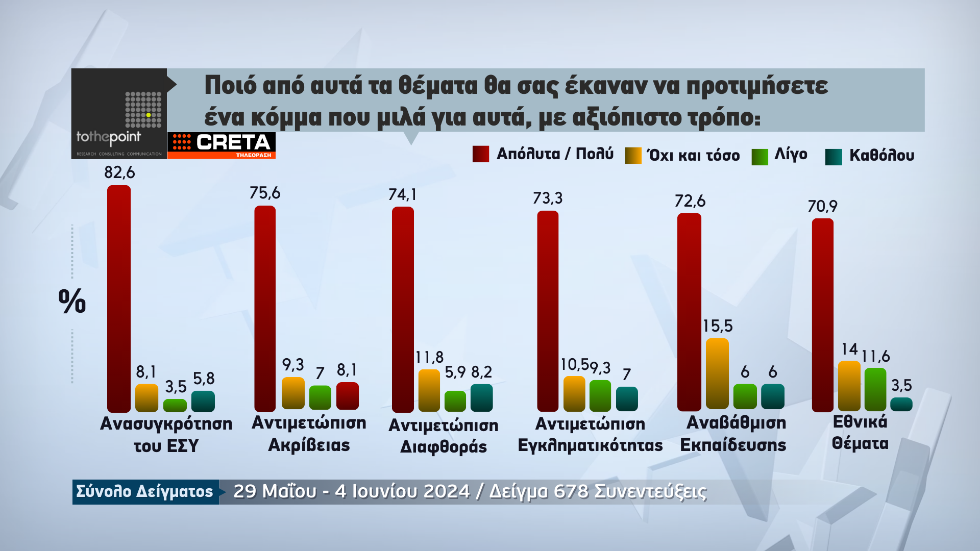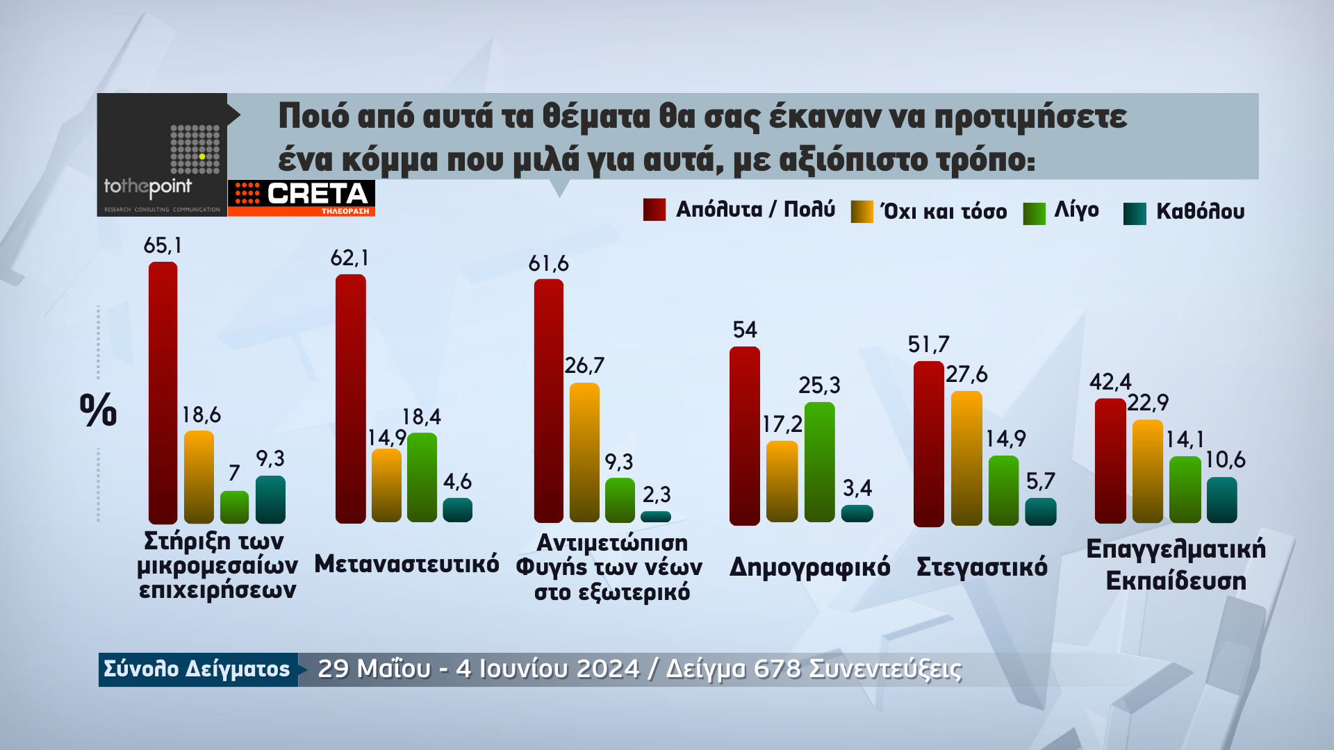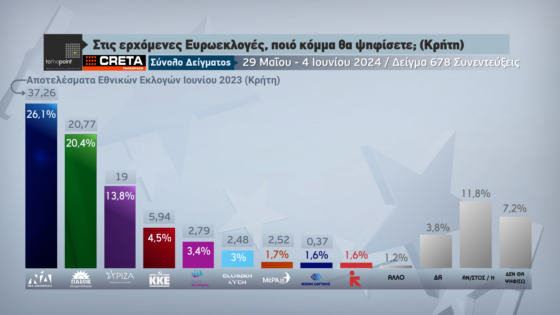 Λίγα 24ωρα πριν από τις κρίσιμες ευρωεκλογές της 9ης Ιουνίου, η μεγάλη δημοσκόπηση που πραγματοποιήθηκε από την εταιρεία ερευνών «Το The Point» για λογαριασμό τηλεόρασης CRETA δίνει εικόνα που καταγράφεται στην Κρήτη .