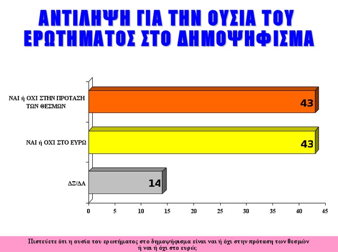 Σε ό,τι αφορά το ερώτημα του δημοψηφίσματος, το 43% θεωρεί οτι απαντά ΝΑΙ ή ΌΧΙ στην πρόταση των θεσμών και το 43% θεωρεί απαντά ΝΑΙ ή ΟΧΙ στο ευρώ.