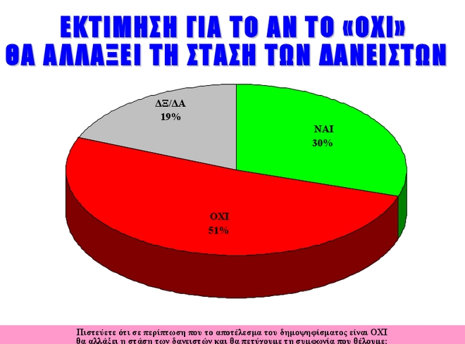 Πάντως, το 51% θεωρεί ότι το ΟΧΙ δεν θα αλλάξει τη στάση των δανειστών, όπως προσδοκά η κυβέρνηση.