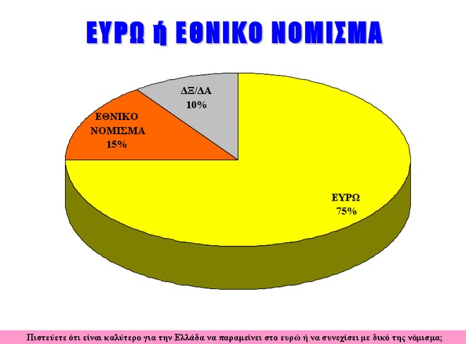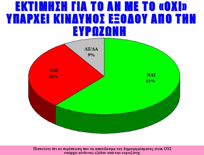Το 61% των πολιτών πιστεύει ότι με το όχι υπάρχει κίνδυνος εξόδου από το ευρώ, ενώ ένα ποσοστό 15% που θέλει εθνικό νόμισμα.