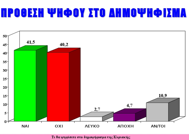 Σύμφωνα με τα στοιχεία της έρευνας, το ΝΑΙ λαμβάνει 41,5%, ενώ το ΟΧΙ κυμαίνεται στο 40,2 %.