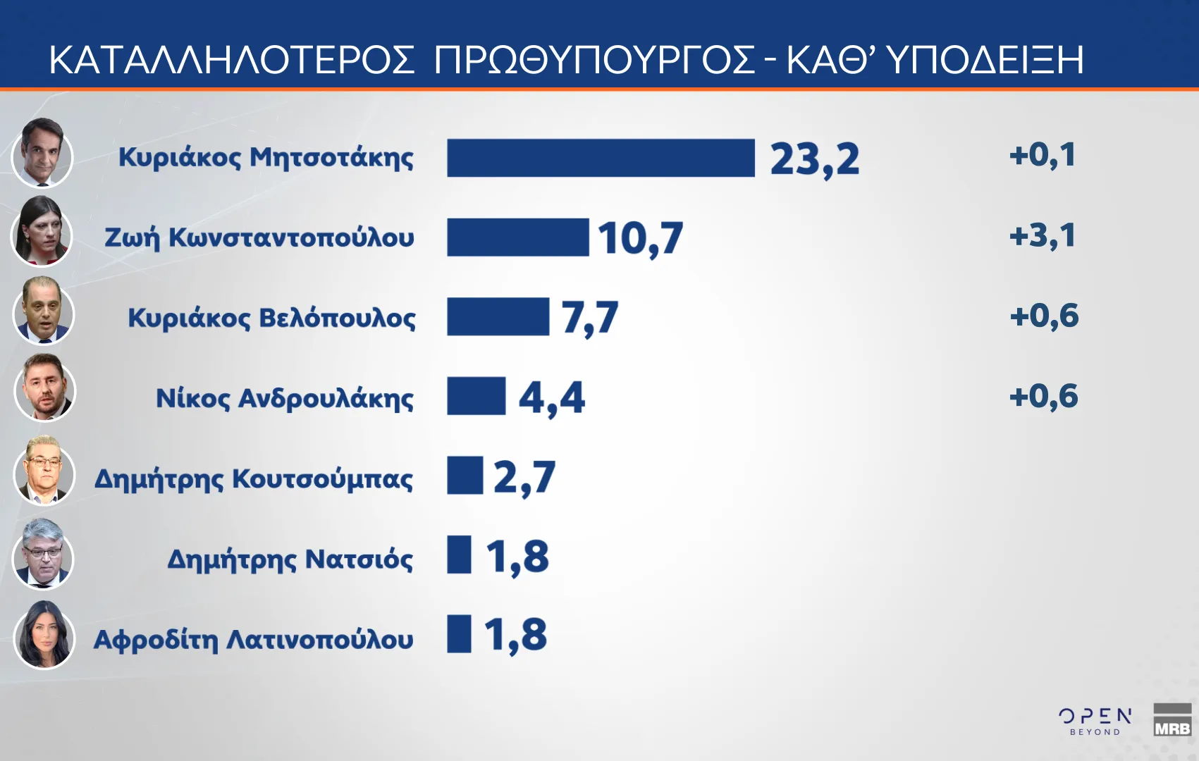 Σε ό,τι αφορά το καταλληλότερο πρόσωπο για πρωθυπουργός, στην πρώτη θέση παραμένει ο Κυριάκος Μητσοτάκης με 23,2%, ακολουθεί η Ζωή Κωνσταντοπούλου με 10,6%, τρίτος ο Κυριάκος Βελόπουλος με 7,7% και στην τέταρτη θέση έρχεται ο Νίκος Ανδρουλάκης με 4,4%.