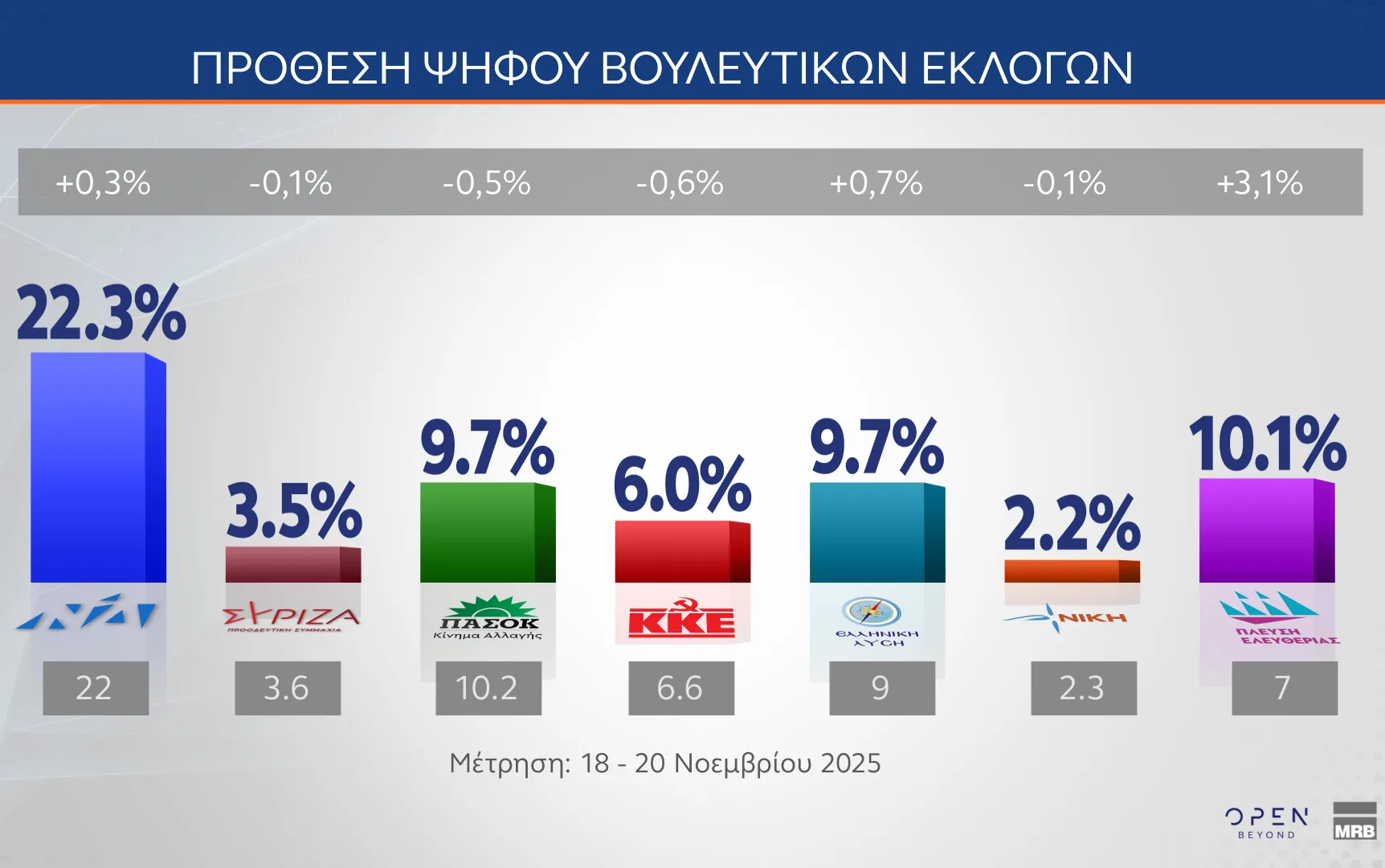 Προβάδισμα 12,2 ποσοστιαίων μονάδων παρουσιάζει η ΝΔ στη νέα δημοσκόπηση της MRB που παρουσιάστηκε στο κεντρικό δελτίο ειδήσεων του OPEN.