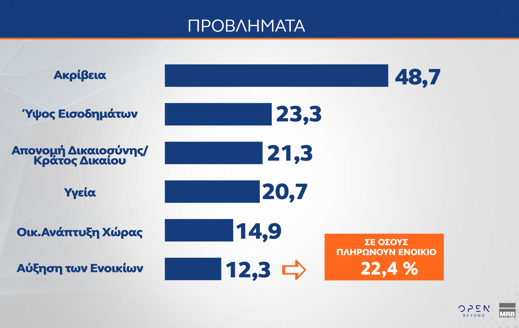 Ακόμη μια δημοσκόπηση παρουσιάζει την ακρίβεια ως το μεγαλύτερο πρόβλημα των πολιτών, με ποσοστό 48,7%. Στη δεύτερη θέση ακολουθεί το ύψος εισοδημάτων με 23,3% και τρίτη η απονομή δικαιοσύνης/κράτος δικαίου, με 21,3%.