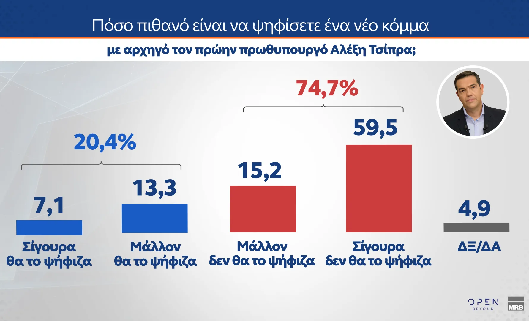 Σε ό,τι αφορά το υπό δημιουργία κόμμα του Αλέξη Τσίπρα στο ερώτημα «πόσο πιθανό είναι να ψηφίσετε ένα νέο κόμμα με αρχηγό τον πρώην πρωθυπουργό Αλέξη Τσίπρα» καταγράφονται τα εξής: