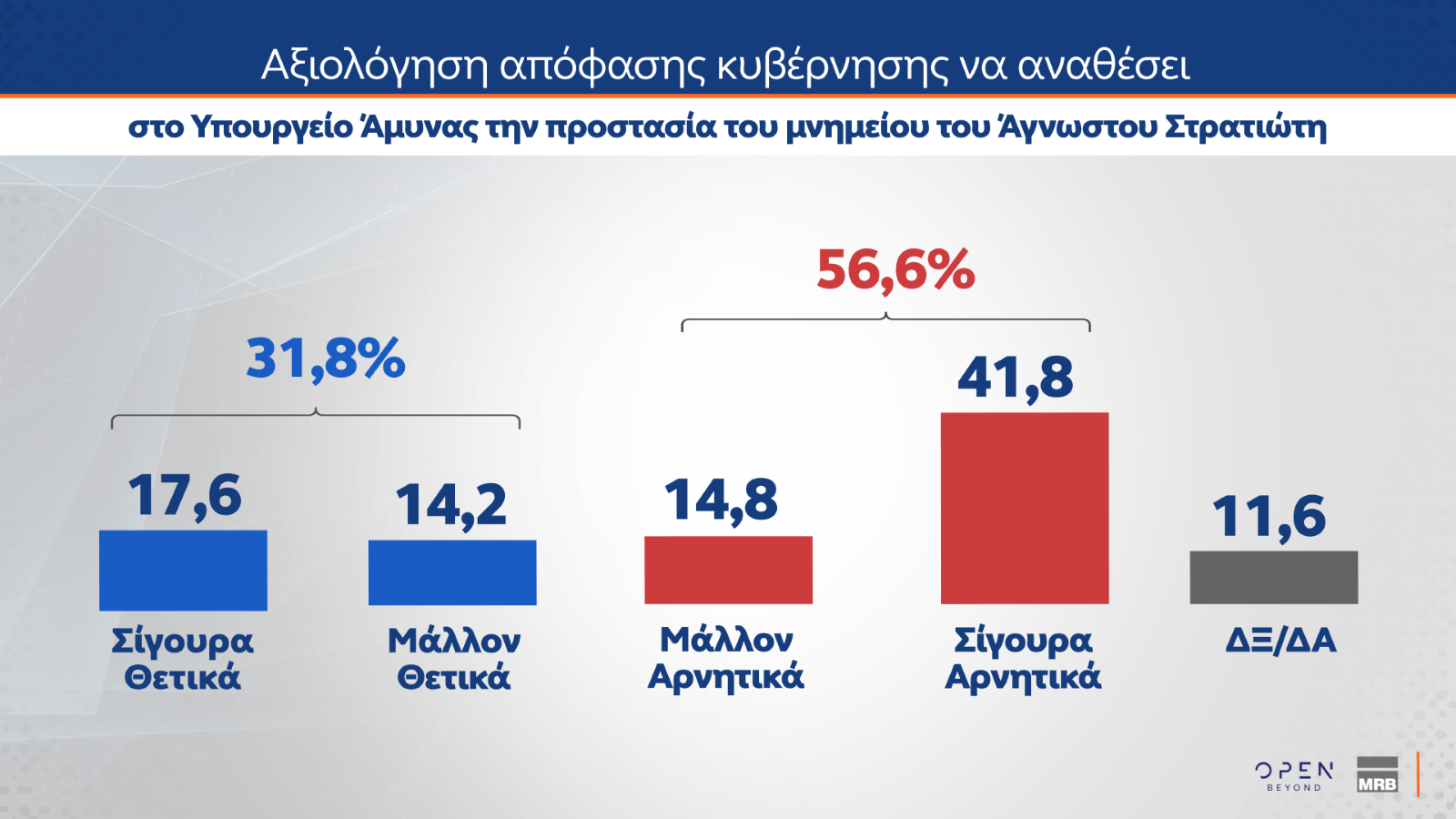 Σχετικά με την απόφαση της κυβέρνησης να αναθέσει την προστασία του Μνημείου στο Υπουργείο Άμυνας, το 56,6% αξιολογεί αρνητικά την απόφαση.