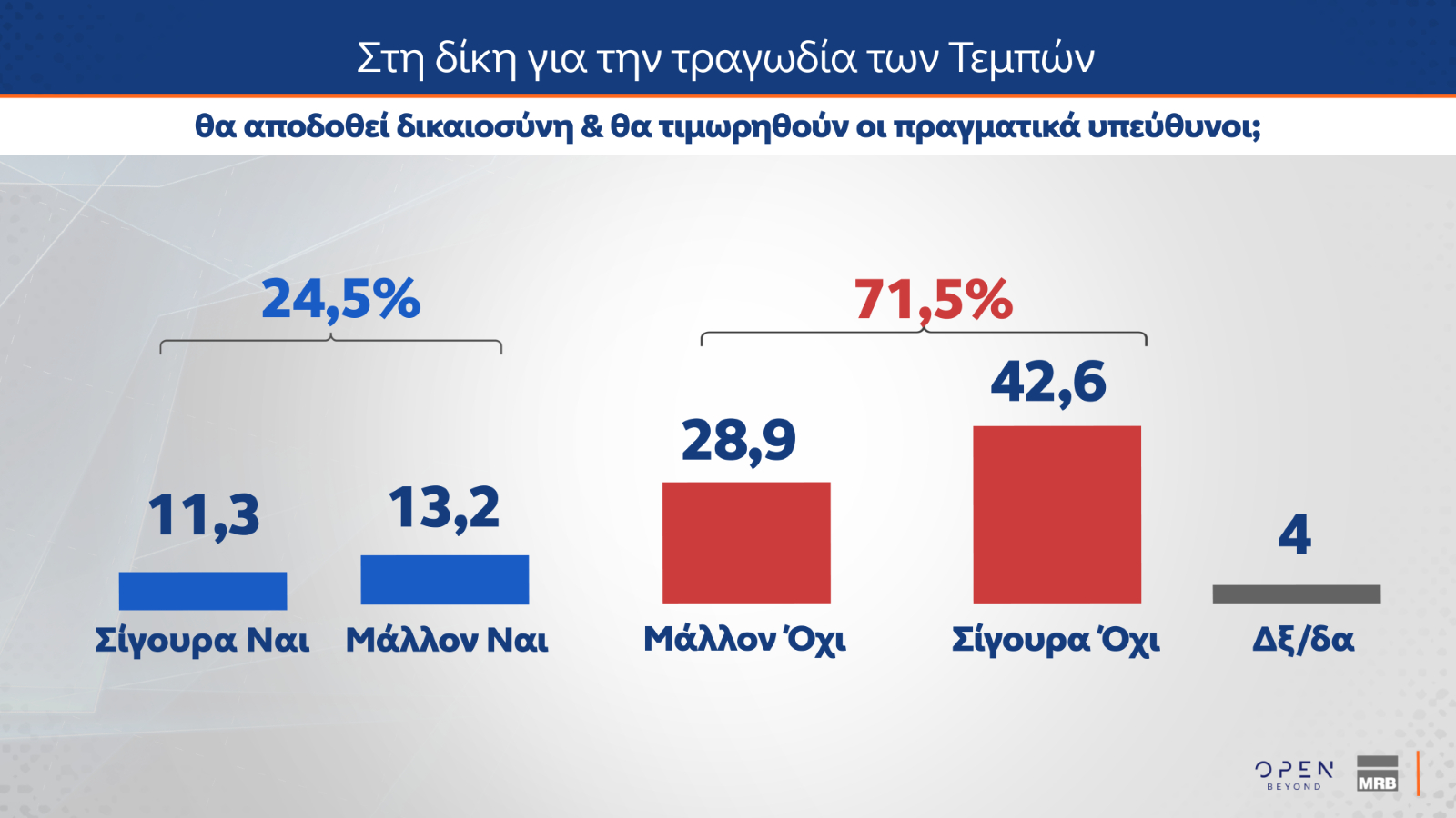 Την ίδια στιγμή, σε ελεύθερη πτώση βρίσκεται η εμπιστοσύνη των πολιτών στη Δικαιοσύνη, με το 71,5% να μην πιστεύει ότι θα αποδοθεί δικαιοσύνη και πως θα τιμωρηθούν οι πραγματικοί υπεύθυνοι, στη δίκη για το έγκλημα των Τεμπών.