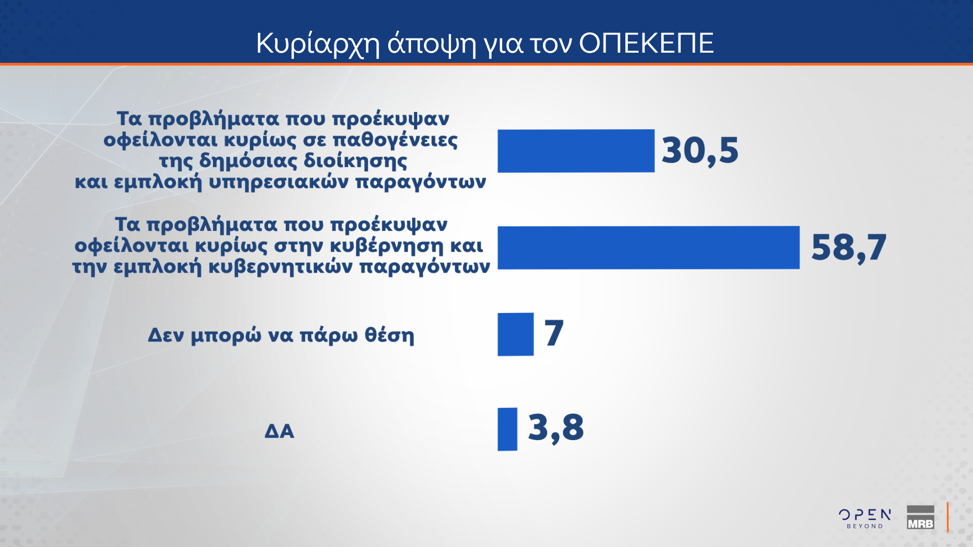 Σε αυτό έρχεται να προστεθεί και η υπόθεση του ΟΠΕΚΕΠΕ, που φαίνεται να προκαλεί σημαντική πολιτική φθορά στη Νέα Δημοκρατία. Συγκεκριμένα, η πλειοψηφία των ερωτηθέντων πιστεύει πως τα προβλήματα με τον ΟΠΕΚΕΠΕ οφείλονται κυρίως στην κυβέρνηση και την εμπλοκή κυβερνητικών παραγόντων ενώ σε ερώτηση για το εάν θα αποδοθεί δικαιοσύνη και θα επιστραφούν τα χρήματα το 77,2% απαντά αρνητικά.