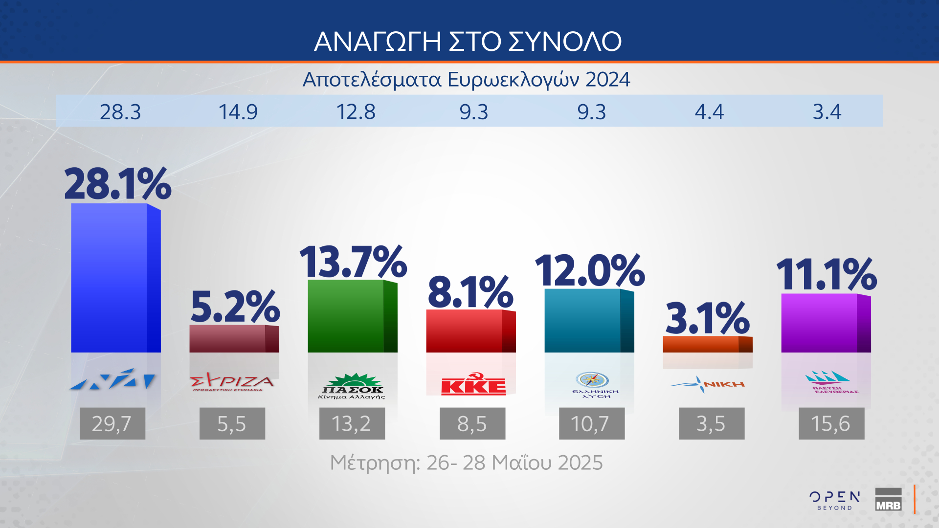 Όταν τα αποτελέσματα αποτυπώνονται στην εκτίμηση ψήφου επί του συνόλου, η ΝΔ φτάνει στο 28,1%, το ΠΑΣΟΚ καταγράφει 13,7%, η Ελληνική Λύση ακολουθεί με 12% και η Πλεύση Ελευθερίας αγγίζει το 11,1%.