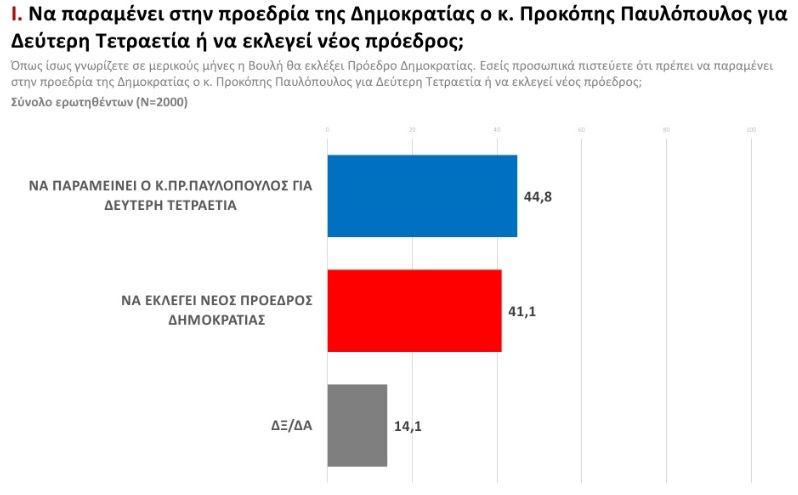Ως προς την επικείμενη εκλογή Προέδρου Δημοκρατίας σημαντικό ποσοστό των πολιτών (44,8%) δηλώνουν ότι θα επιθυμούσαν να παραμείνει ο Προκόπης Παυλόπουλος για δεύτερη θητεία ενώ το 41,1% επιθυμεί νέο πρόσωπο στην θέση του Προέδρου της Δημοκρατίας.
