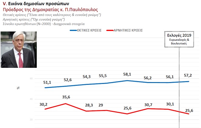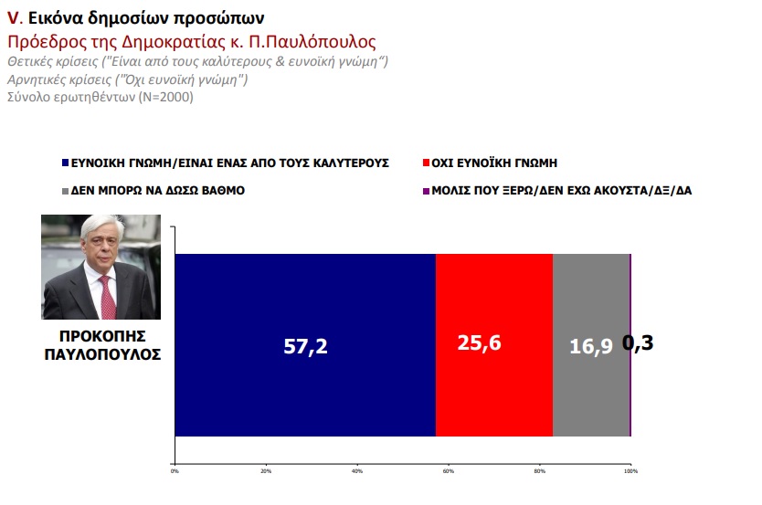 Ως προς τις θειτικές κρίσεις για τα δημόσια πρόσωπα ο κ. Παυλόπουλος συγκεντρώνει το 57,2% αυτών των ψήφων.