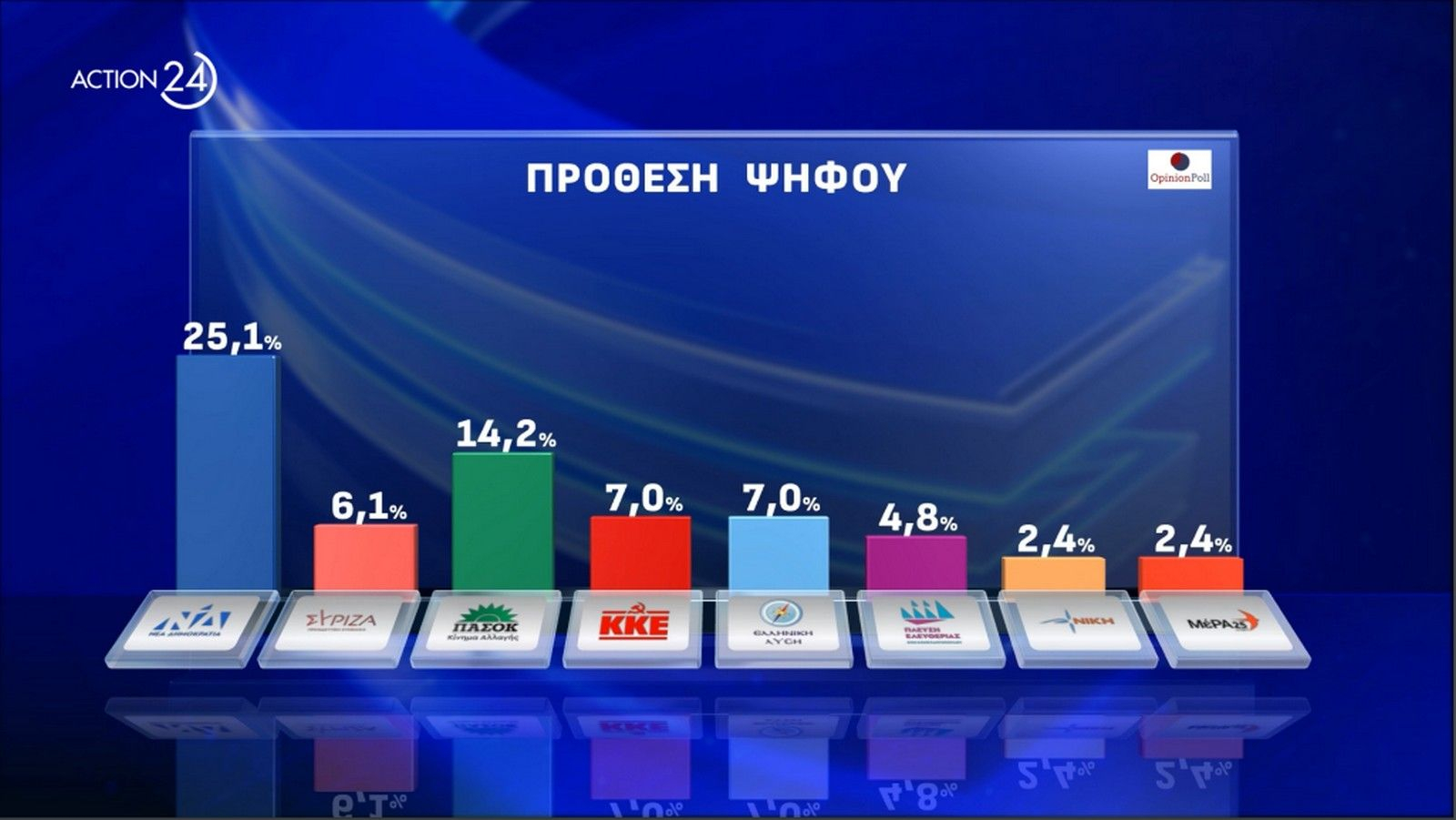 Στην απλή πρόθεση ψήφου τα αποτελέσματα είναι: Ν.Δ. 25.1%, ΠΑΣΟΚ 14.2%, Κ.Κ.Ε. και Ελληνική Λύση 7%, ΣΥΡΙΖΑ 6.1%, Φωνή Λογικής 5%, Πλεύση Ελευθερίας 4.8%, Κίνημα Δημοκρατίας 3.4%, Νίκη και ΜέΡΑ 25 2.4%, Νέα Αριστερά 1.7%, Σπαρτιάτες 1%, Άλλο 1.3%, Λευκό/ Άκυρο 2.8%, Αποχή 3.3%, Αναποφάσιστοι 12.6%.