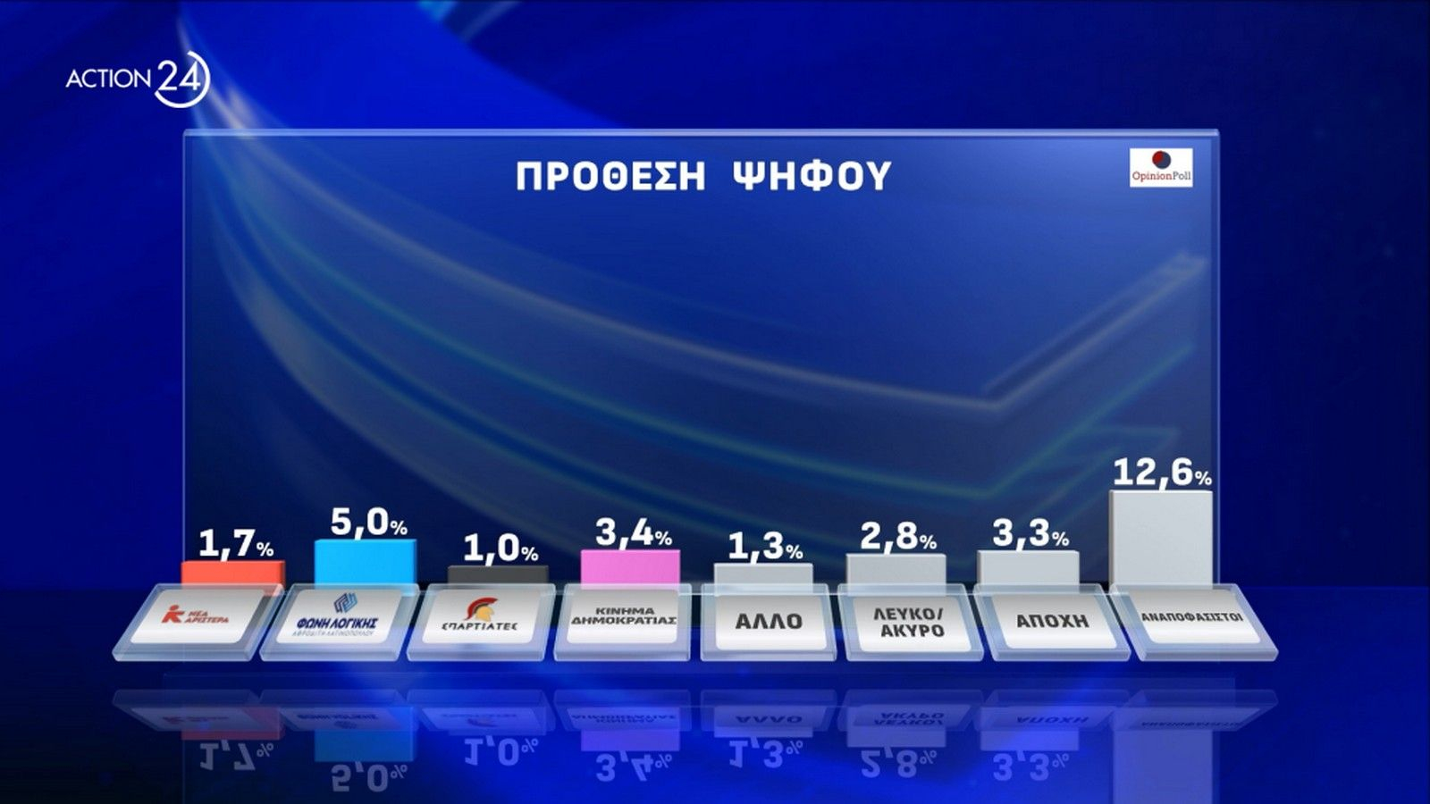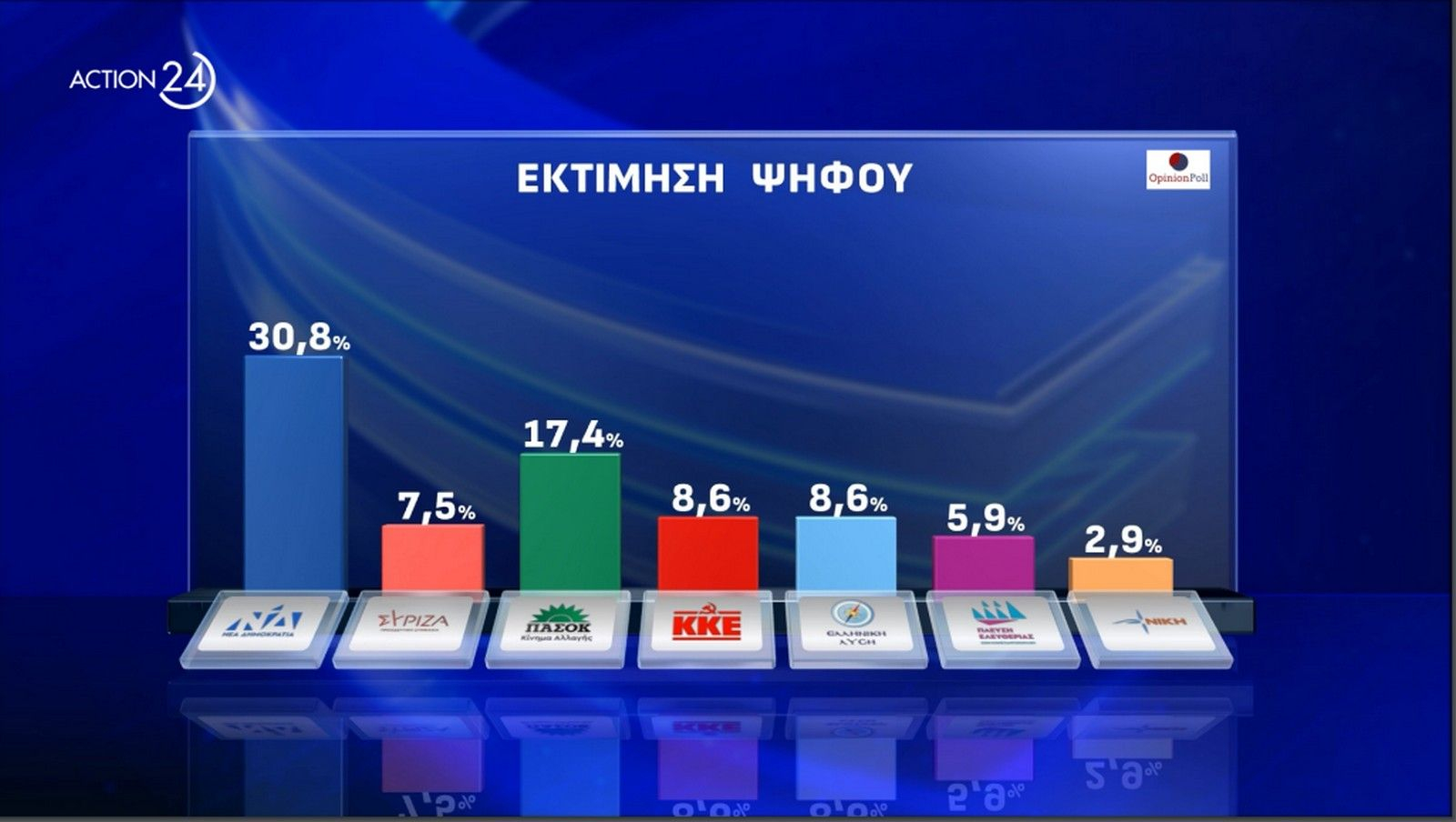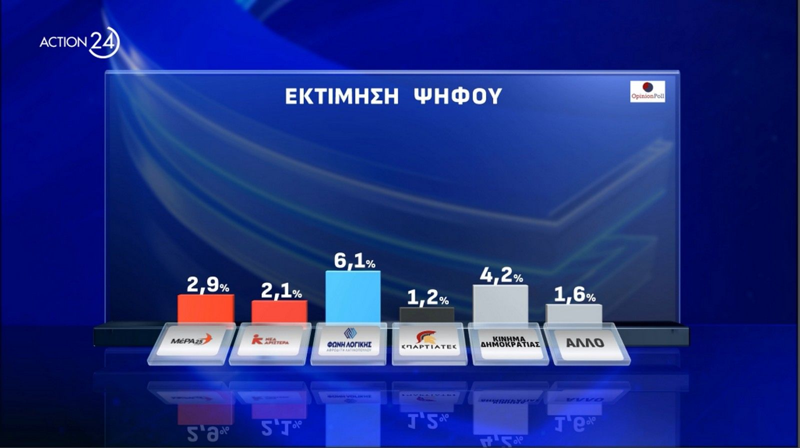 Οχτώ κόμματα εμφανίζονται να μπαίνουν στην Βουλή, με άλλα δύο πάντως ΝΙΚΗ και ΜΕΡΑ 25) , να βρίσκονται στο 2.9%.Τα υπόλοιπα κόμματα συγκεντρώνουν: Κ.Κ.Ε. και Ελληνική Λύση 8.6%, Φωνή Λογικής 6.1%, Πλεύση Ελευθερίας 5.9%, Κίνημα Δημοκρατίας 4.2%, Νέα Αριστερά 2.1%, Σπαρτιάτες 1.2.