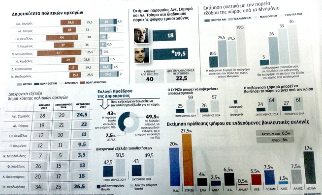 Στη δημοσκόπηση που δημοσιεύεται στο Βήμα της Κυριακής ο ΣΥΡΙΖΑ συγκεντρώνει το 27,4 των ερωτηθέντων έναντι 23,5 της ΝΔ, η ΧΑ 6,4, το ΠΑΣΟΚ 5,8, το ΠΟΤΑΜΙ, 5,6, το ΚΚΕ 5,3, οι ΑΝΕΛ 3,8, ο ΛΑΟΣ 1,6 και η ΔΗΜΑΡ 1,1%.