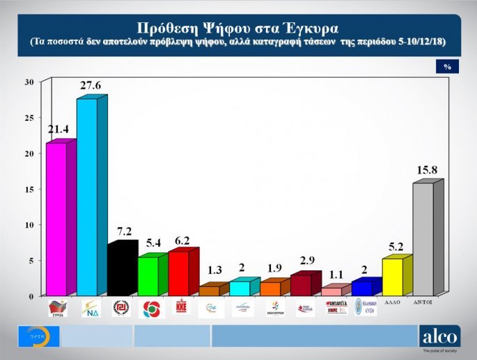 Προβάδισμα 6,2% της Νέας Δημοκρατίας έναντι του ΣΥΡΙΖΑ στην πρόθεση ψήφου επί των εγκύρων καταγράφει δημοσκόπηση της ALCO για λογαριασμό του OPEN.