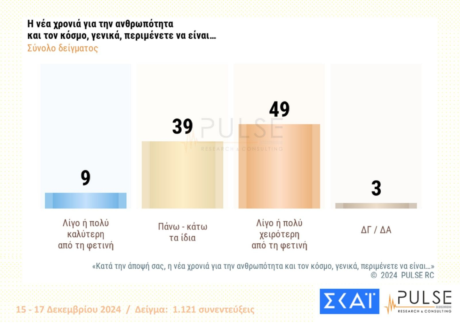 To 49% εκτιμά πως το 2025 θα είναι χειρότερο από το 2024, ενώ το 39% πως θα είναι πάνω-κάτω στα ίδια, ενώ το 9% απαντά πως η νέα χρονιά θα είναι καλύτερη.